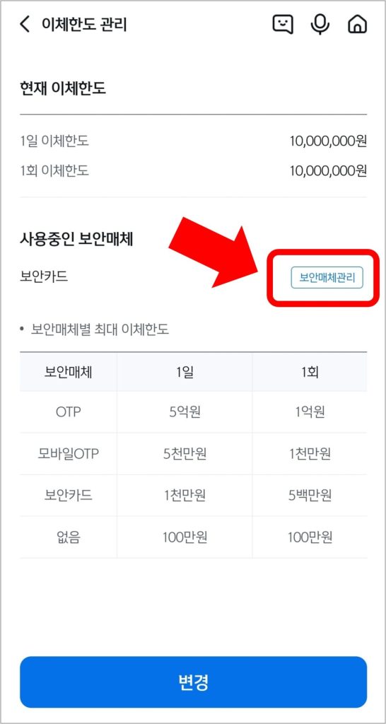 이체한도 관리 페이지에서 현재 이체한도와 사용 중인 보안매체를 확인할 수 있습니다.
