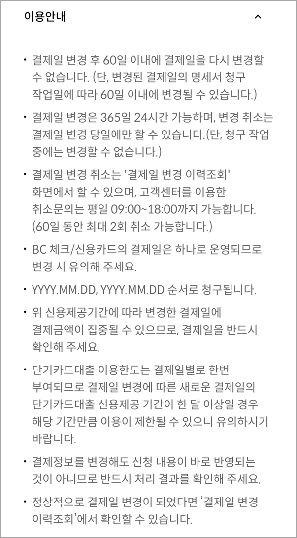 결제일 변경은 365일 24시간 가능하지만, 한번 결제일을 변경하면 60일 이내에 재변경은 불가하니 주의하시길 바랍니다.