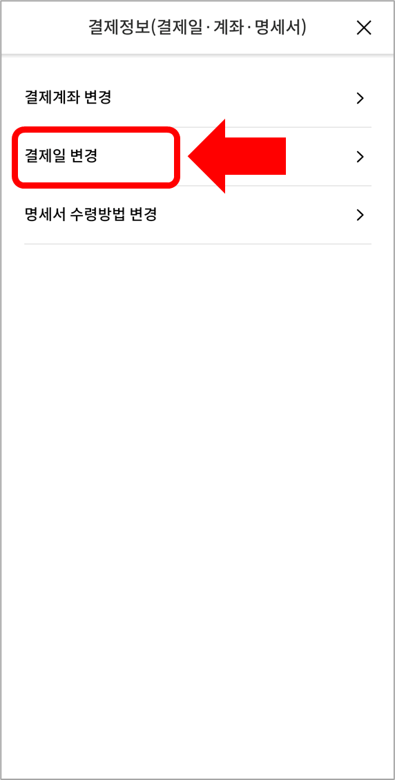그리고 [결제일 변경]으로 가서 결제일을 변경할 카드를 선택하고 [변경하기]를 누릅니다.