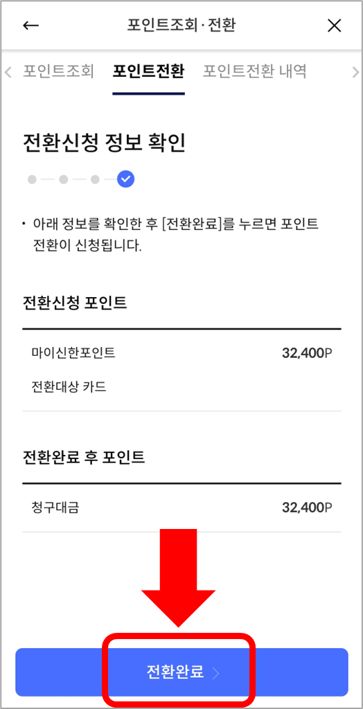 마지막으로 [전환완료]를 누르면 마이신한포인트 전환이 완료됩니다.