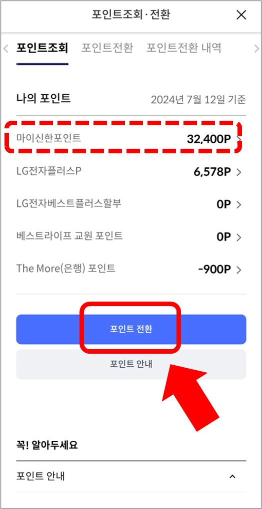 본인이 소유한 마이신한포인트를 확인하고 [포인트 전환]을 선택합니다.
