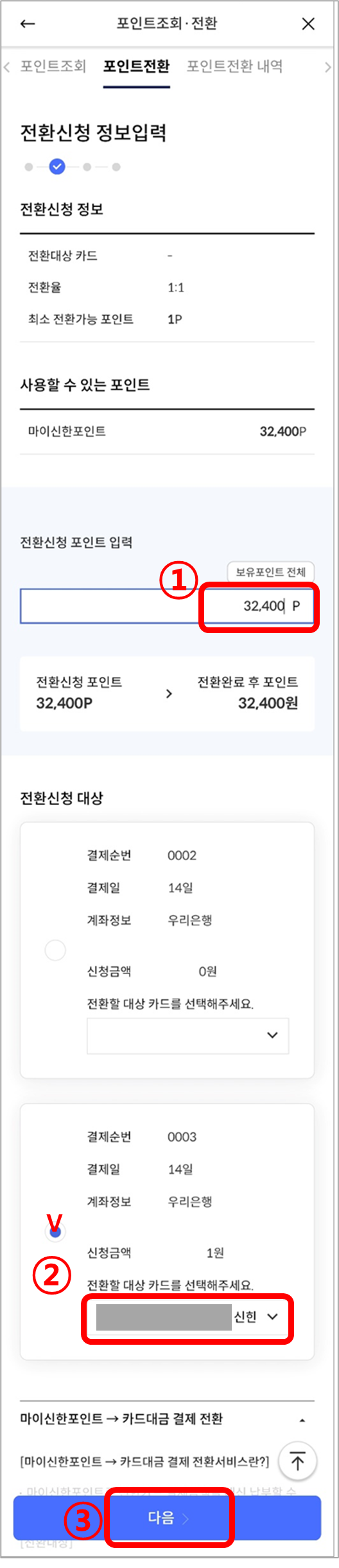 본인이 소유한 신한카드 중에서 포인트를 전환할 카드를 선택합니다.