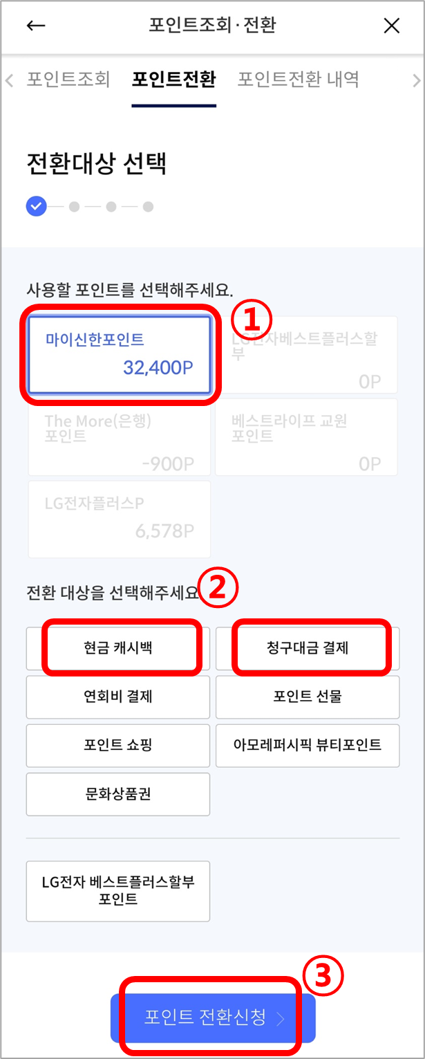중에서 원하는 것을 체크하여 [포인트 전환 신청]을 선택합니다.