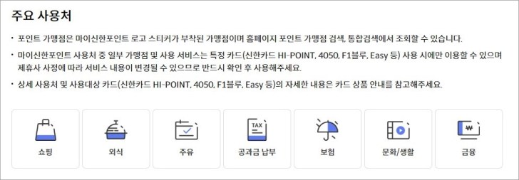 쇼핑, 외식, 주유, 공과금 납부, 보험, 문화/생활, 금융 등의 분야별 가맹점에서 사용할 수 있으며, 마이신한포인트 1 포인트는 현금 1원과 동일한 가치를 가집니다.