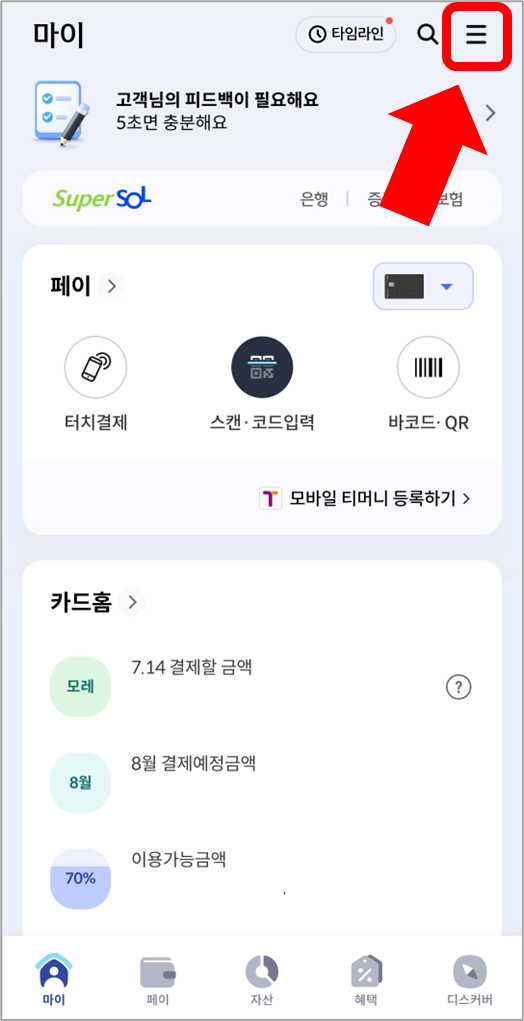 신한SOL페이 앱에서 오른쪽 위에 있는 메뉴 버튼을 선택합니다.