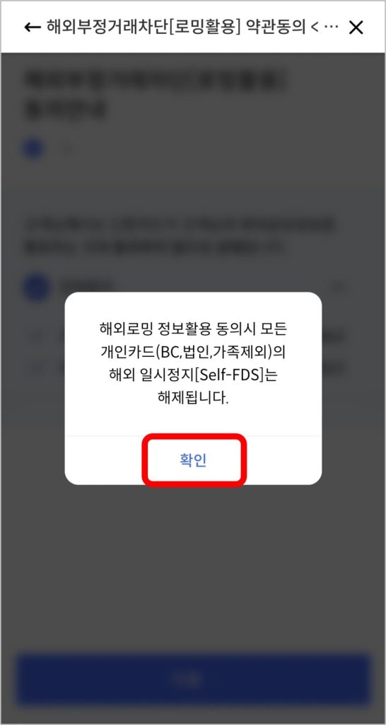 해외로밍정보 활용에 동의하면 별도로 설정했던 해외사용안심설정은 모두 해제됩니다. 따라서 국내에서 온라인 해외결제 사용도 불가능해집니다.