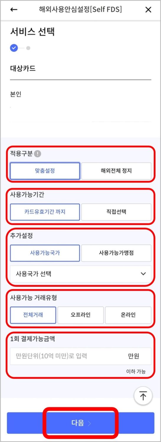 선택한 카드의 해외사용 맞춤 설정을 합니다