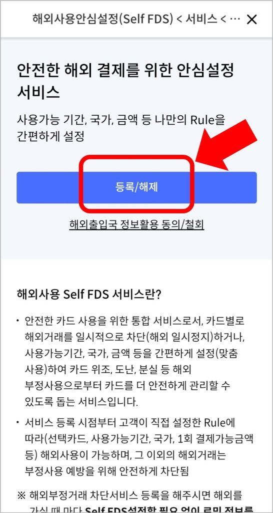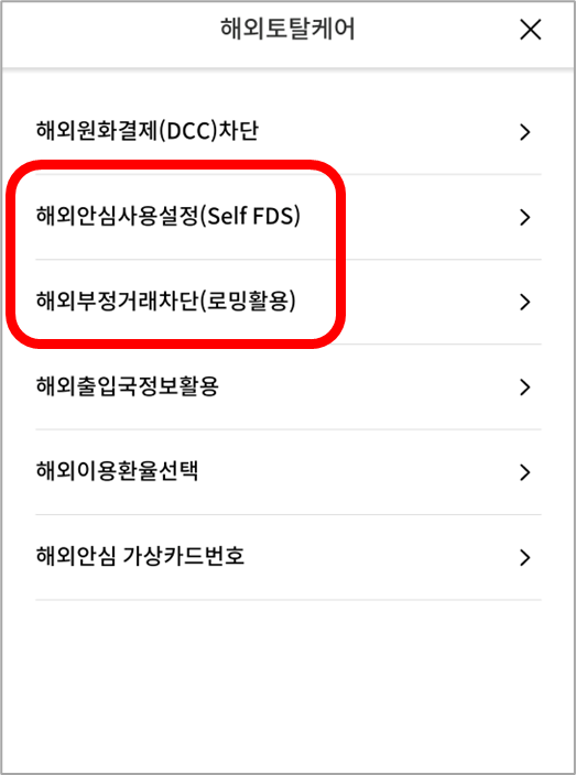 국내에서 직구나 온라인 해외결제를 자주 이용하는 분은 해외사용안심설정을 이용하시길 추천드립니다.
