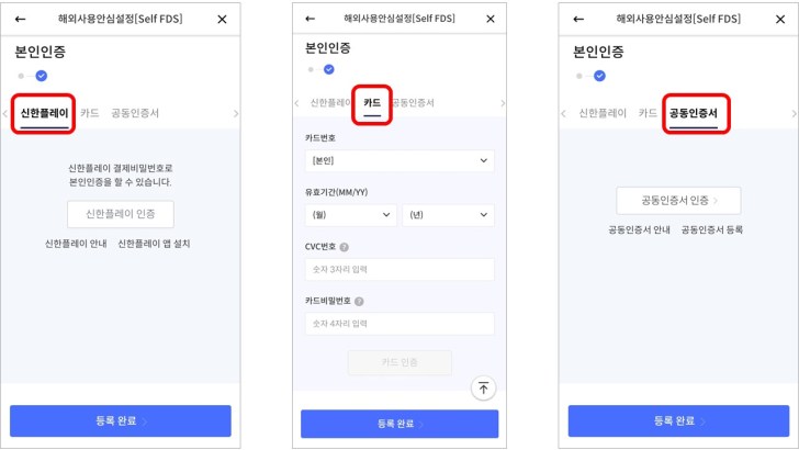 - 카드 : 본인 명의 신한카드의 유효기간, CVC 번호, 비밀번호로 인증(실물카드 필요)