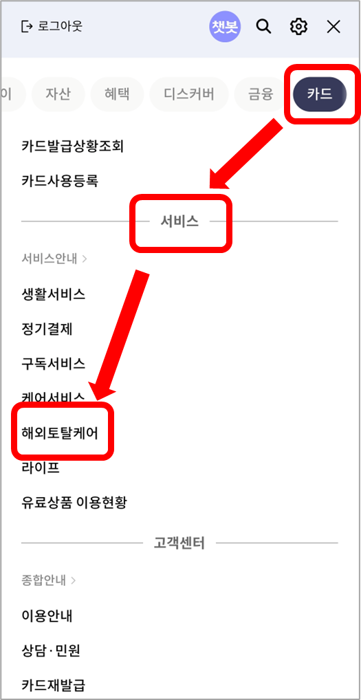 전체메뉴의 [카드 → 서비스 → 해외토탈케어]에서 해외사용안심설정 또는 해외부정거래차단을 선택할 수 있습니다.