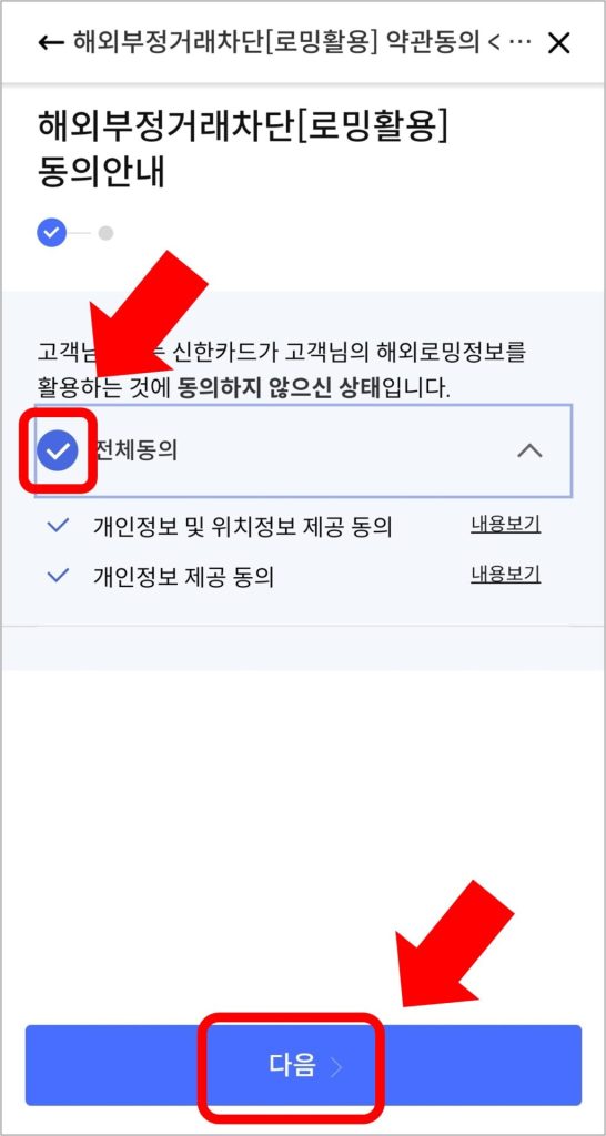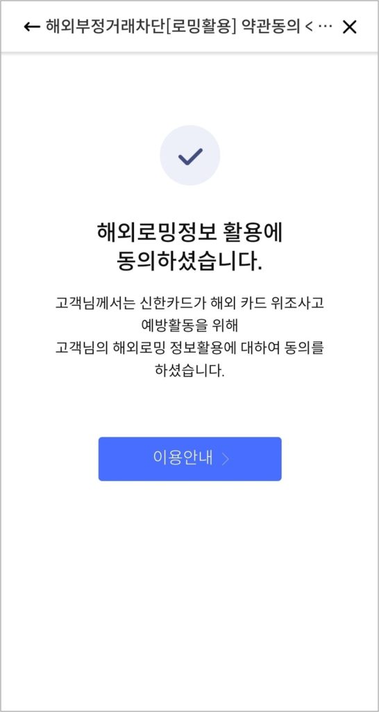해외로밍정보 활용에 동의하면 별도로 설정했던 해외사용안심설정은 모두 해제됩니다. 따라서 국내에서 온라인 해외결제 사용도 불가능해집니다.