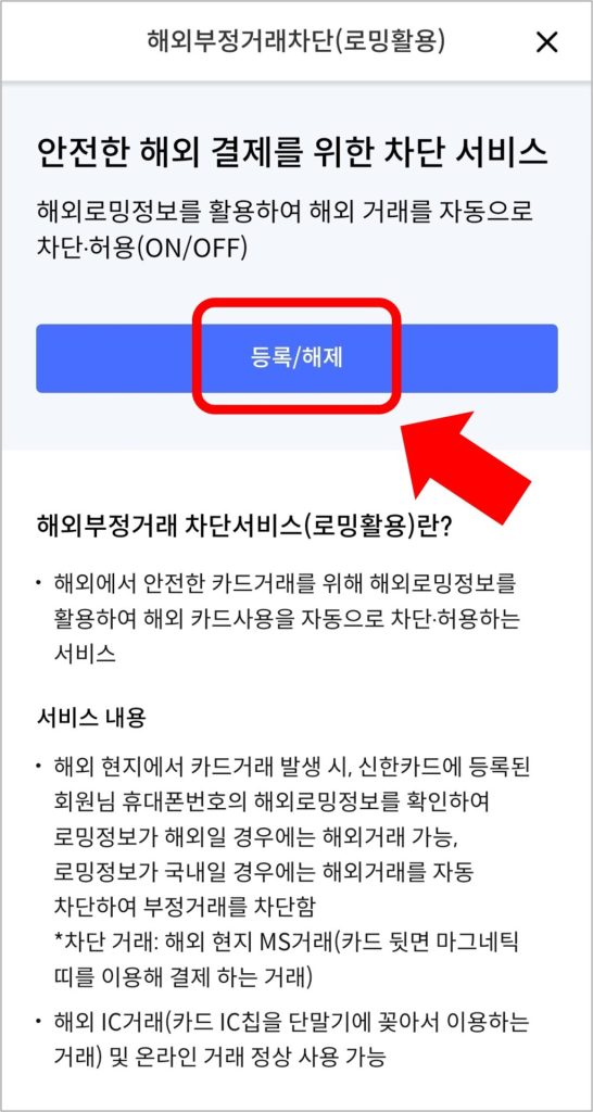 해외부정거래차단은 로밍 정보를 활용해서 해외 현지 거래를 자동으로 차단하는 기능입니다. 이 기능을 활성화하면 해외로 출국하여 휴대폰 로밍이 확인되는 경우에만 해외결제를 할 수 있습니다.