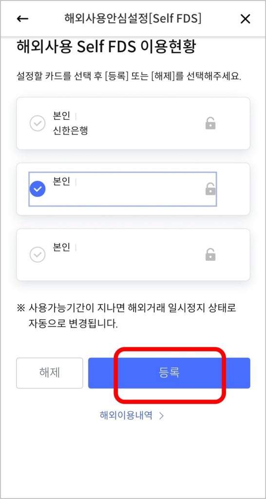 본인이 소지한 신한카드 목록 중에서 해외결제차단을 원하는 카드를 선택합니다.