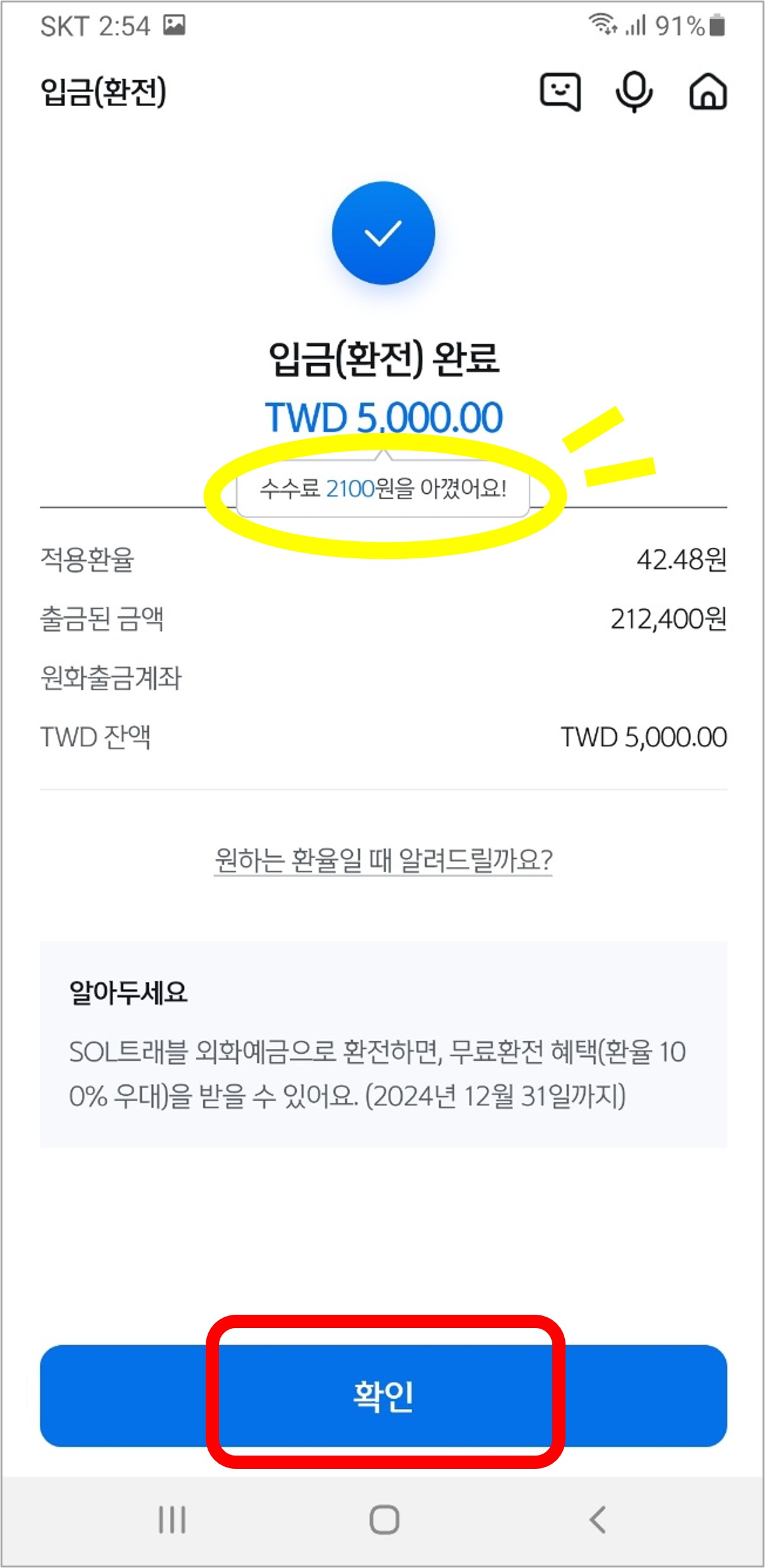 환전이 완료되었습니다. 수수료 2,100원을 아꼈다는 안내문이 나옵니다. 대만달러는 환전 수수료가 1%인가 봅니다. 21만원 환전에 2,100원을 아꼈으니 꽤 쏠쏠하네요.