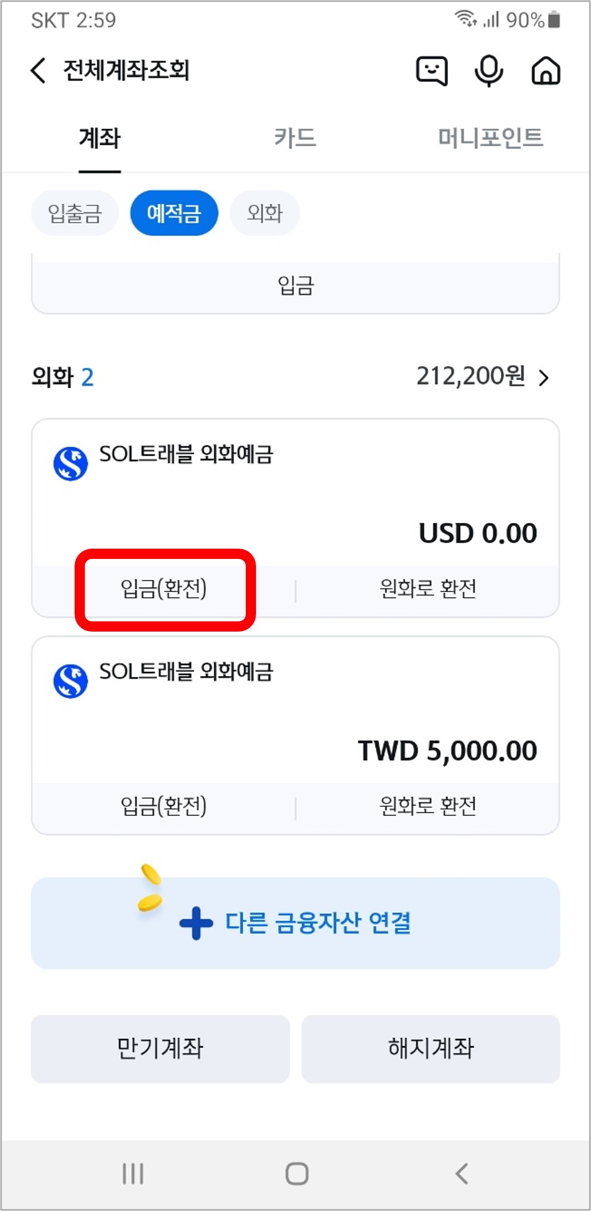 쏠뱅크 앱에서 전체계좌 목록을 보시면, SOL트래블 외화예금 계좌가 있습니다. 입금(환전)을 선택합니다.