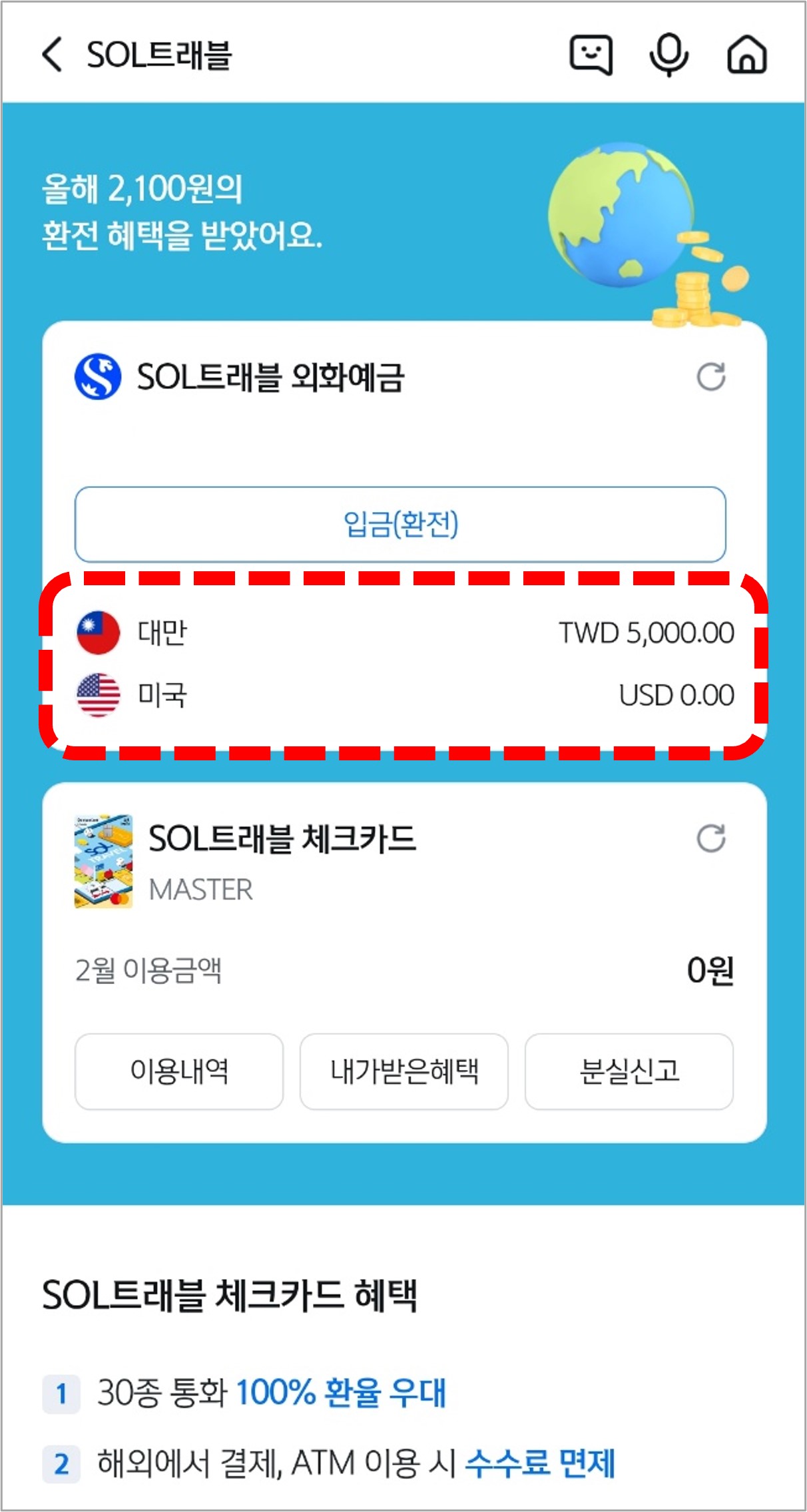 환전 후 쏠뱅크 앱 메인화면에서 쏠트래블 배너를 선택하면 환전된 외화를 확인할 수 있습니다. 계좌에 있는 외화가 통화별로 표기됩니다. 저는 현재 5,000 대만달러를 가지고 있습니다.