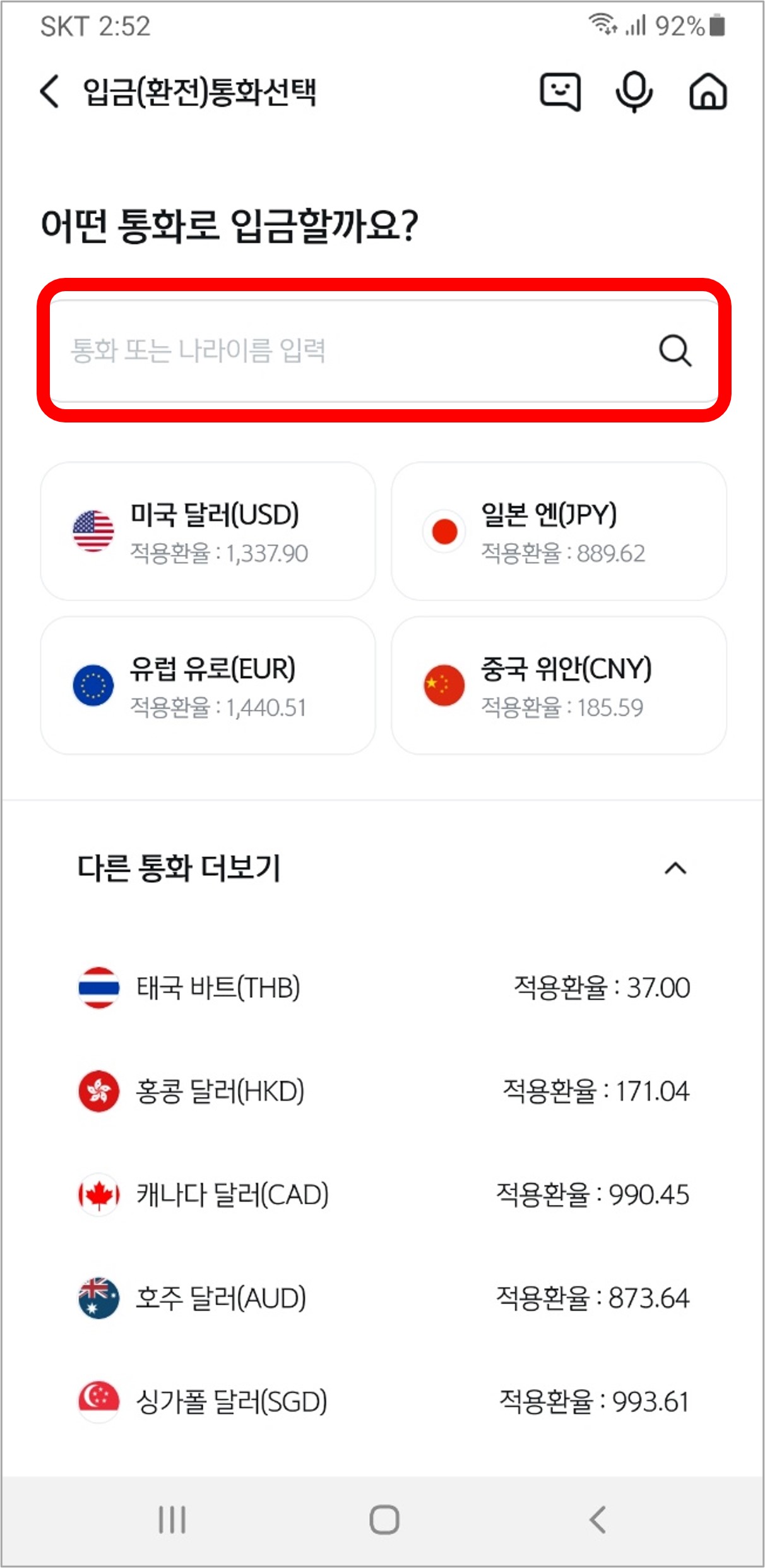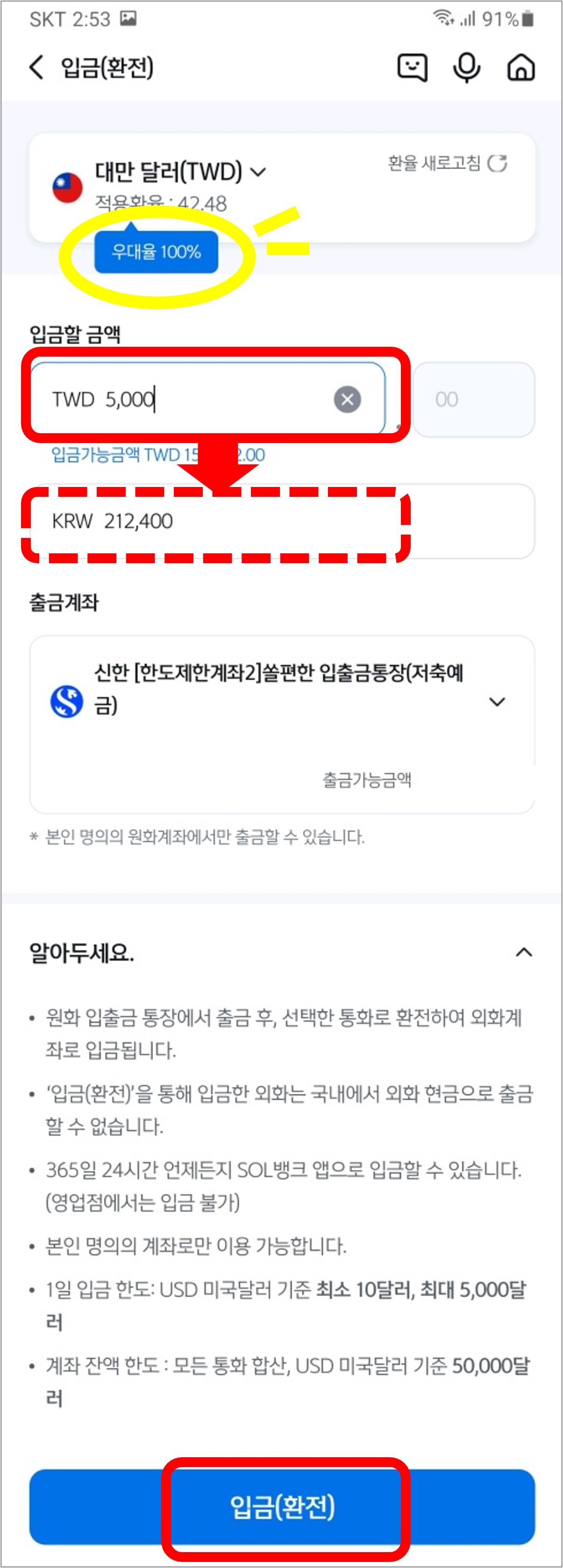 입금(=환전)할 통화를 선택해 주세요. 저는 대만 달러(TWD)를 선택했습니다.