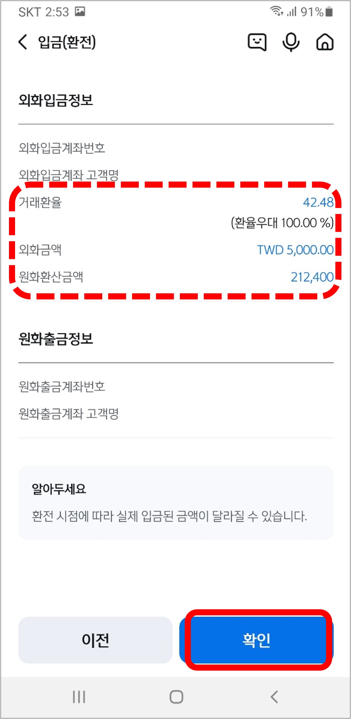 입금정보를 다시 한번 확인합니다. 연결된 출금계좌에서 환전하는 만큼의 원화가 출금되고, 외화계좌에 외화가 입금되는 프로세스입니다.