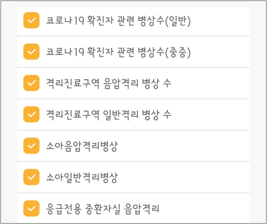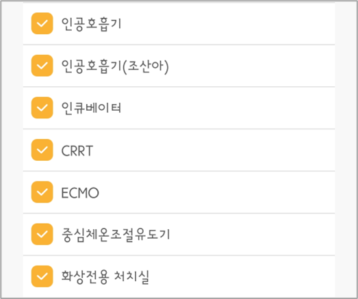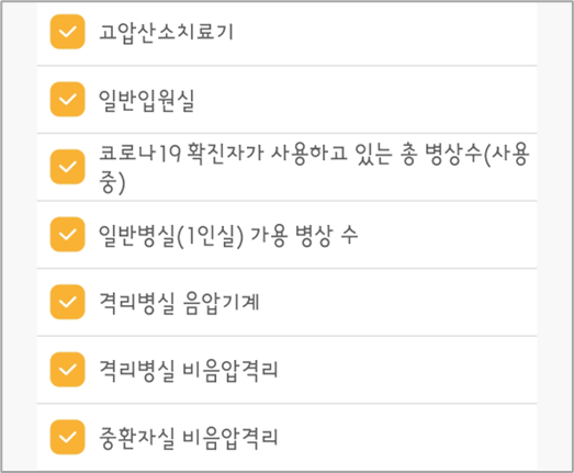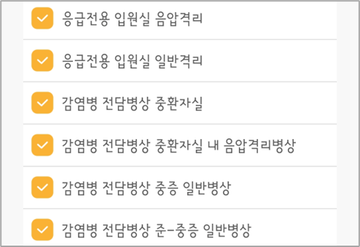 일반 응급실뿐만 아니라, 응급전용 중환자실, 화상중환자실, 소아 중환자실, 소아응급전용, 음압 격리, 화상전용 처치실, 고압산소치료기, 인큐베이터 등 다양한 조건에 따라 응급실을 검색할 수 있습니다.