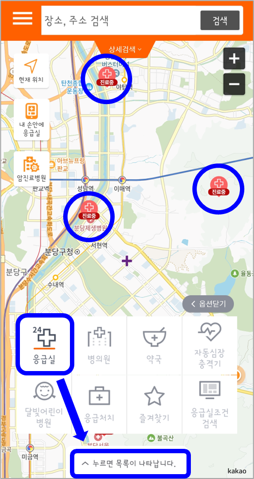 그리고 화면 아래의 [누르면 목록이 나타납니다]를 누르면 현재 진료 중인 응급실 목록을 자세히 볼 수 있습니다.