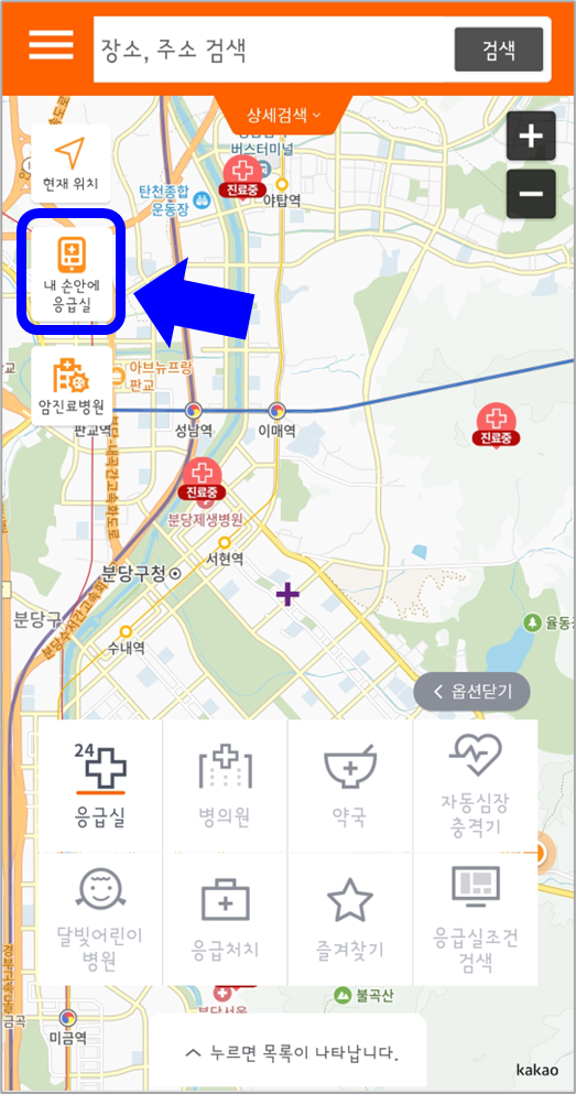 그리고 화면 아래의 [누르면 목록이 나타납니다]를 누르면 현재 진료 중인 응급실 목록을 자세히 볼 수 있습니다.