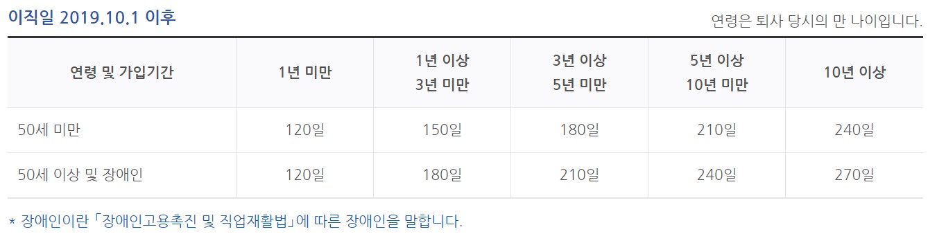 실업급여 지급기간은 연령과 고용보험 가입기간에 따라 다르게 적용됩니다. 최소 120일부터 최대 240일까지 지급되며, 2019년 10월 1일 이후에는 아래의 표를 기준으로 지급기간이 결정됩니다.