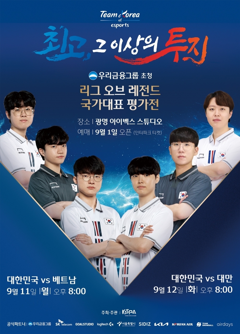 대한민국 e스포츠 선수단은 지난 8월 28일(월) 국가대표 출정식을 가졌습니다. 대표팀은 이상혁(페이커) 선수를 주장으로 하여, 최우제(제우스), 서진형(카나비), 정지훈(쵸비), 박재혁(룰러), 류민석(케리아)로 발표되었습니다.