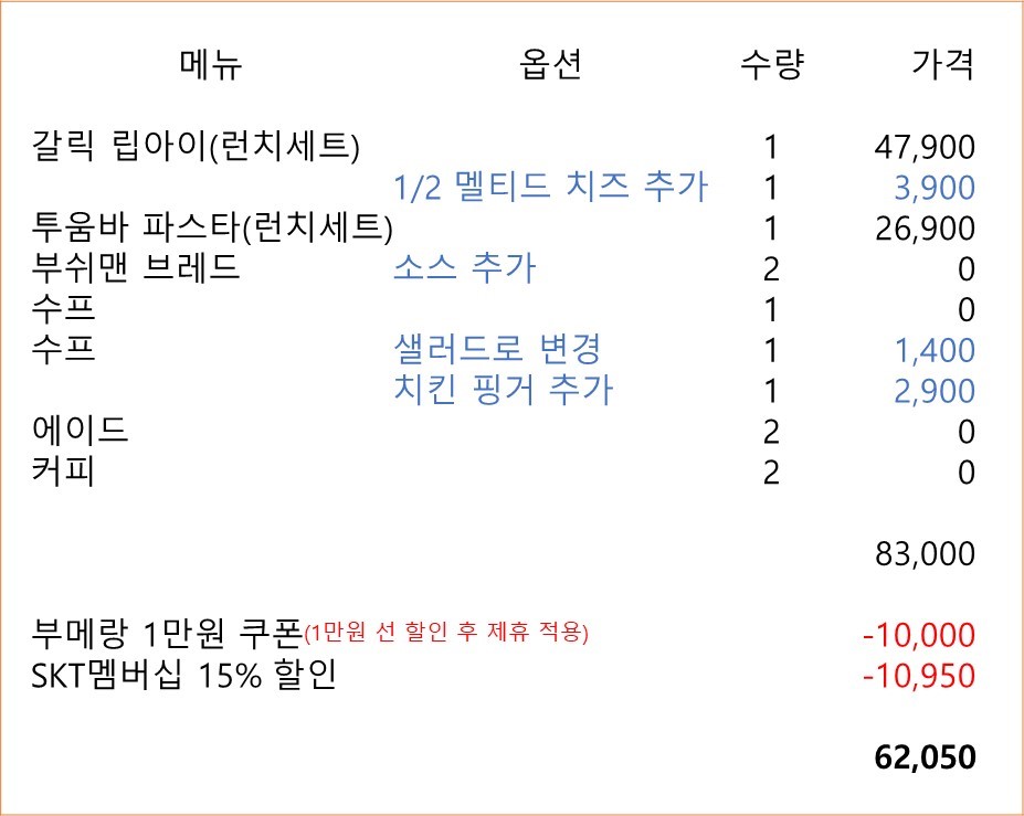위에서 추천해 드린 메뉴로 주문 후 아웃백 할인 방법을 적용하면 보통 25% 정도 할인받을 수 있습니다.