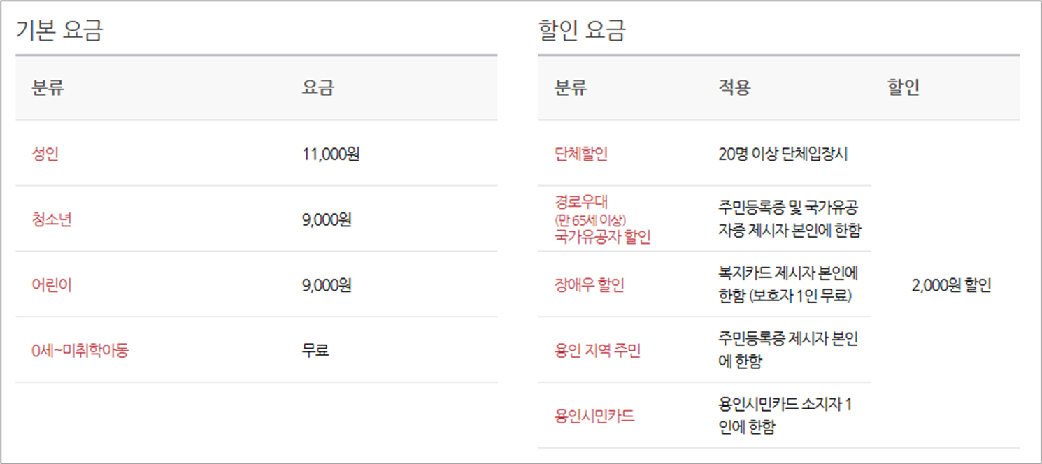 20명 이상 단체, 경로, 장애인, 용인시민은 2,000원 할인 혜택을 받을 수 있습니다.