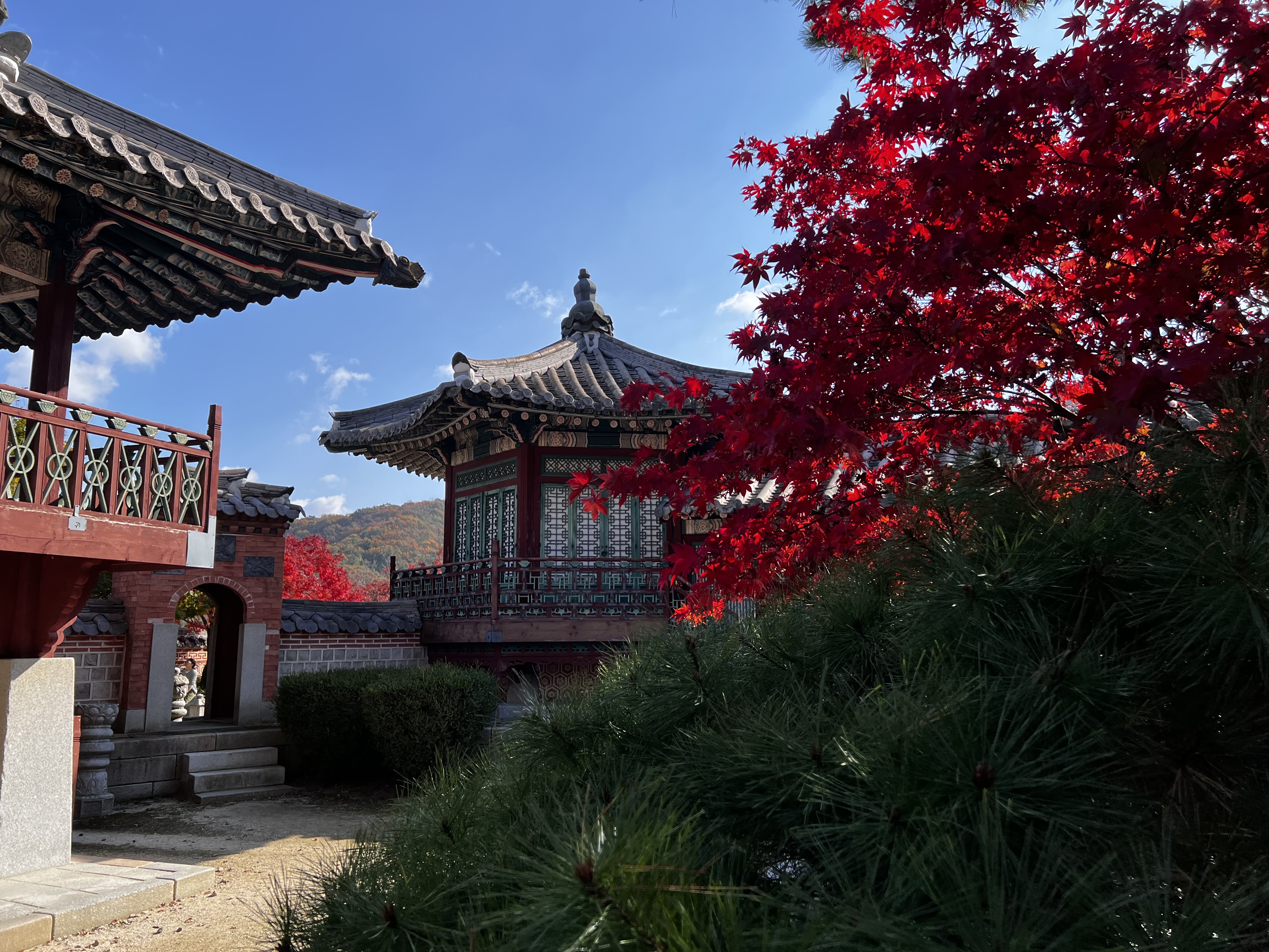 대장금파크의 또 다른 매력은 자연 속에서 여유롭게 산책할 수 있다는 점입니다. 마침 단풍이 예쁘게 들기 시작할 때라 궁궐과 함께 아름다운 풍경을 감상할 수 있었습니다.