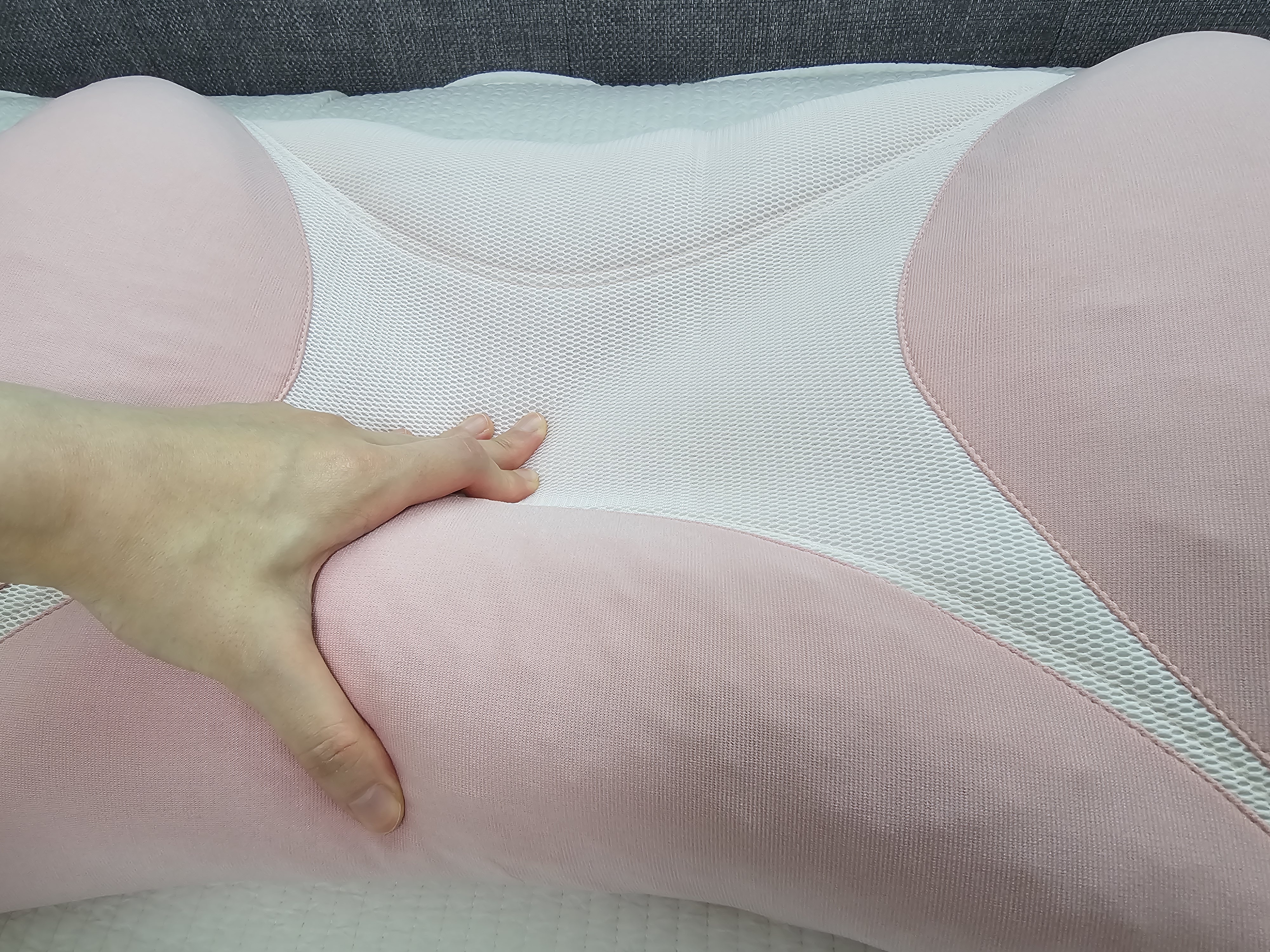 양 옆과 경추 한 면은 부드러운 소재이고, 베개 한 가운데와 경추 한 곳은 메쉬 소재입니다.