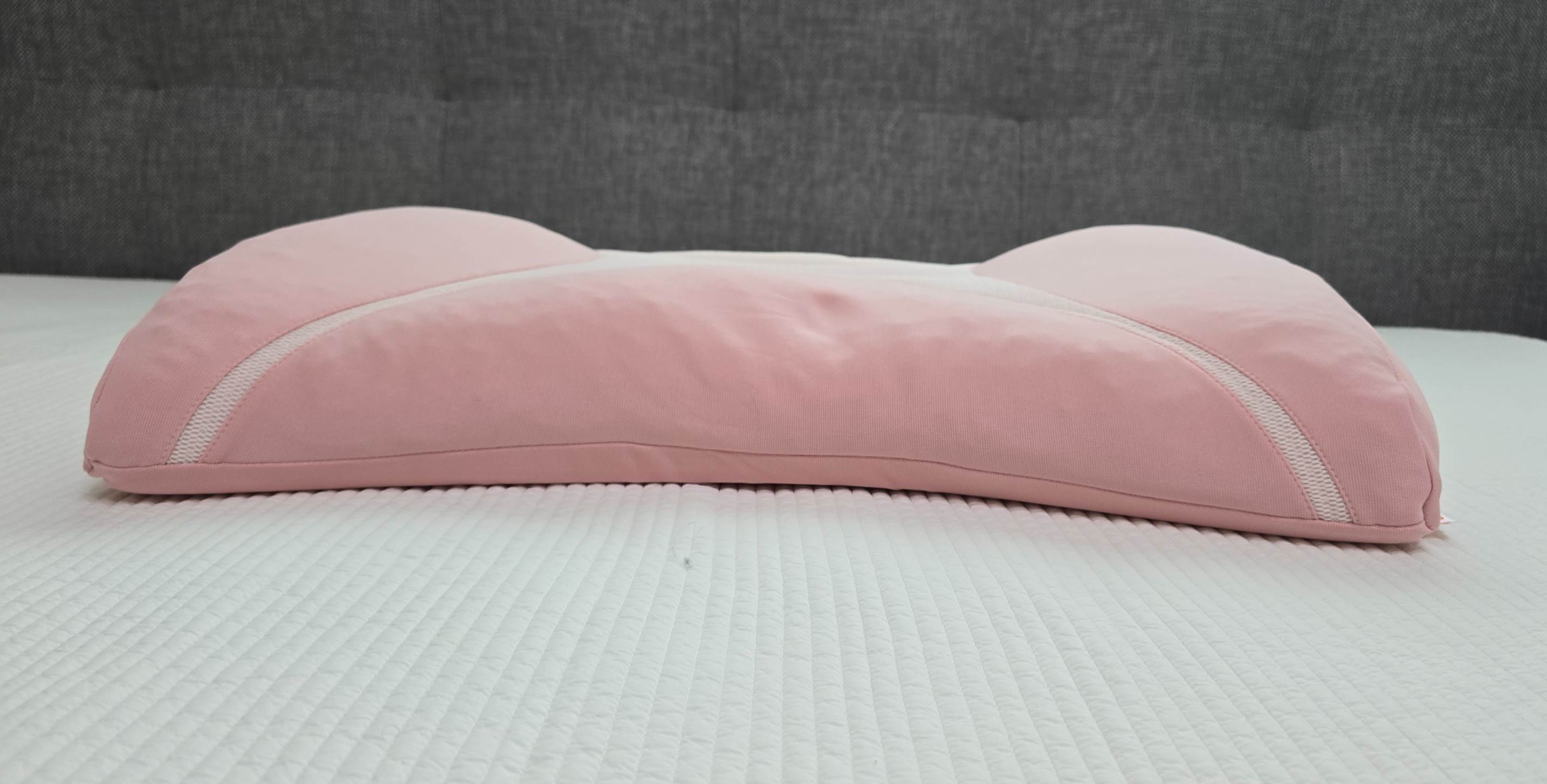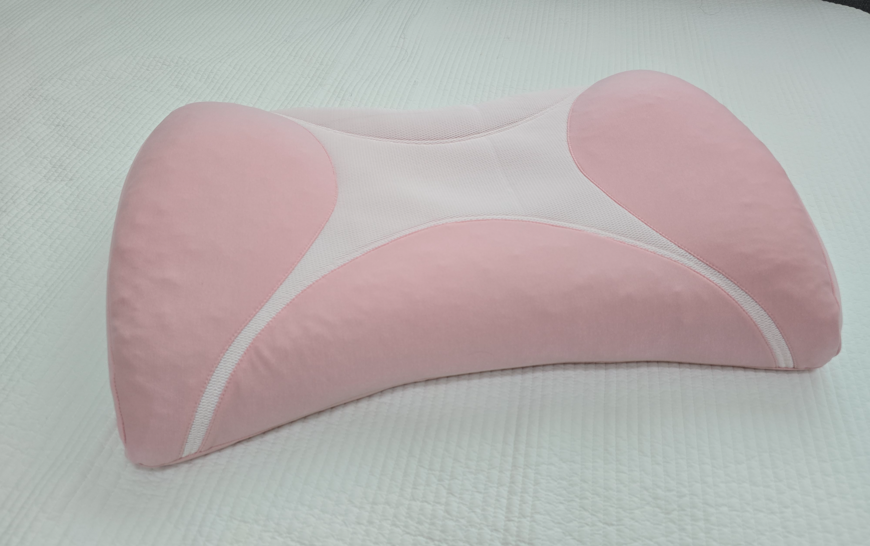사진에서 보시듯이 베개의 양 옆이 높고, 가운데 부분은 경추를 받쳐주는 구조로 되어 있습니다.