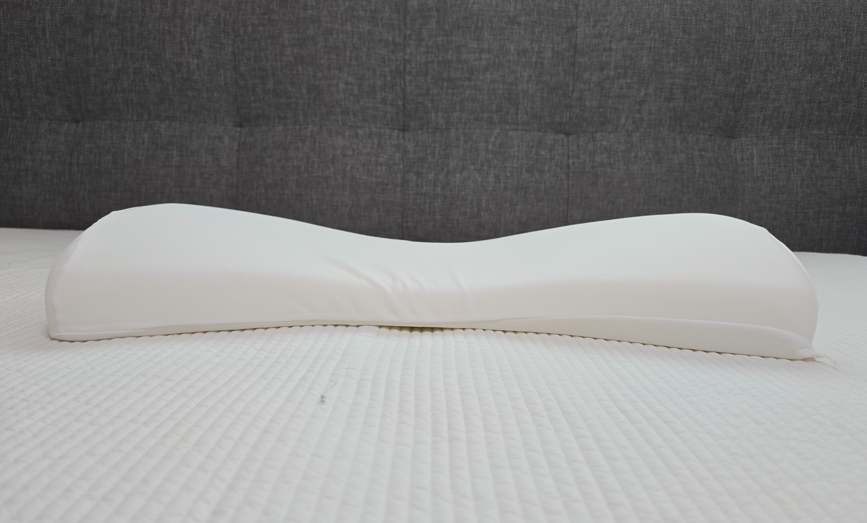 사진에서 보시듯이 베개의 양 옆이 높고, 가운데 부분은 경추를 받쳐주는 구조로 되어 있습니다.