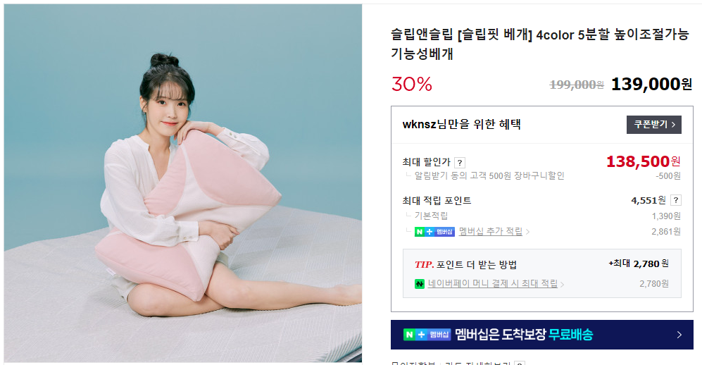 슬림핏 베개 가격은 139,000원입니다. 여기저기 사이트를 둘러봤지만 대부분 같은 가격이었고, 슬립앤슬립 홈페이지에서는 신규회원 5,000원 쿠폰을 받을 수 있습니다.