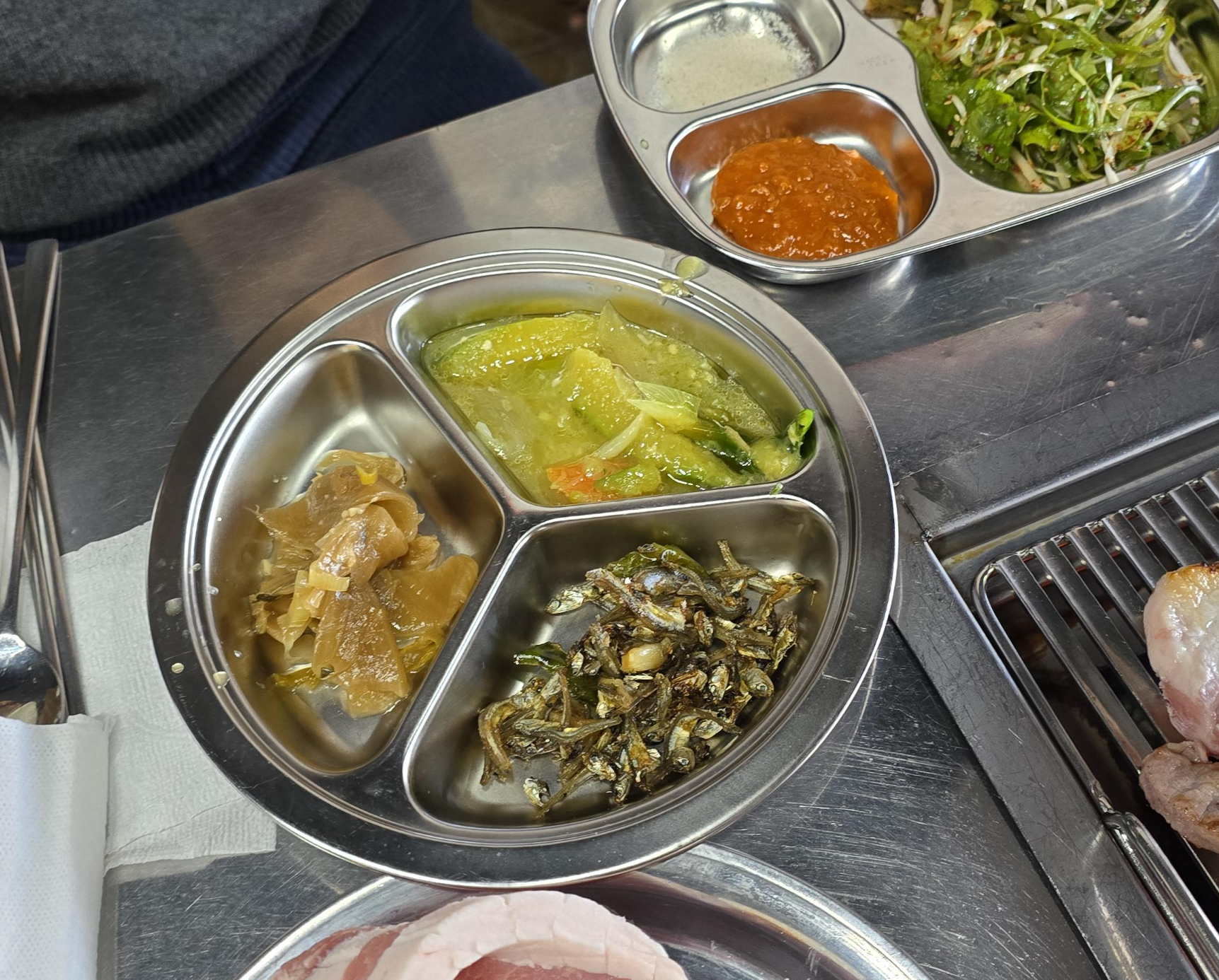밑반찬 중에 저 묵은지 볶음이 특히 맛있었습니다. 군내 없이 새콤하고 고소해서 고기와 같이 먹기에도 좋았습니다.