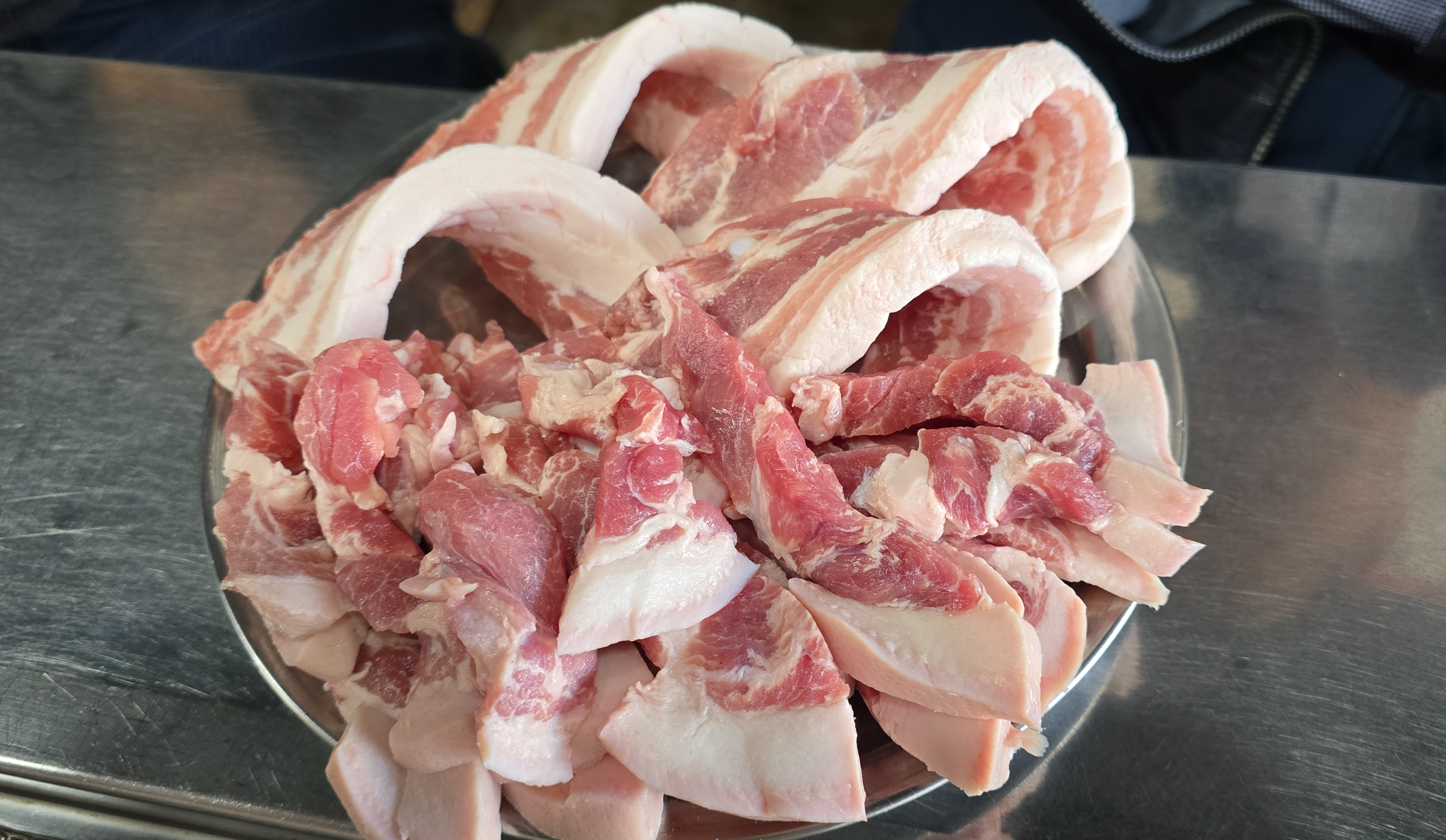목덜미살은 이렇게 껍질과 지방 살코기가 적당한 비율로 잘려져 나옵니다.
