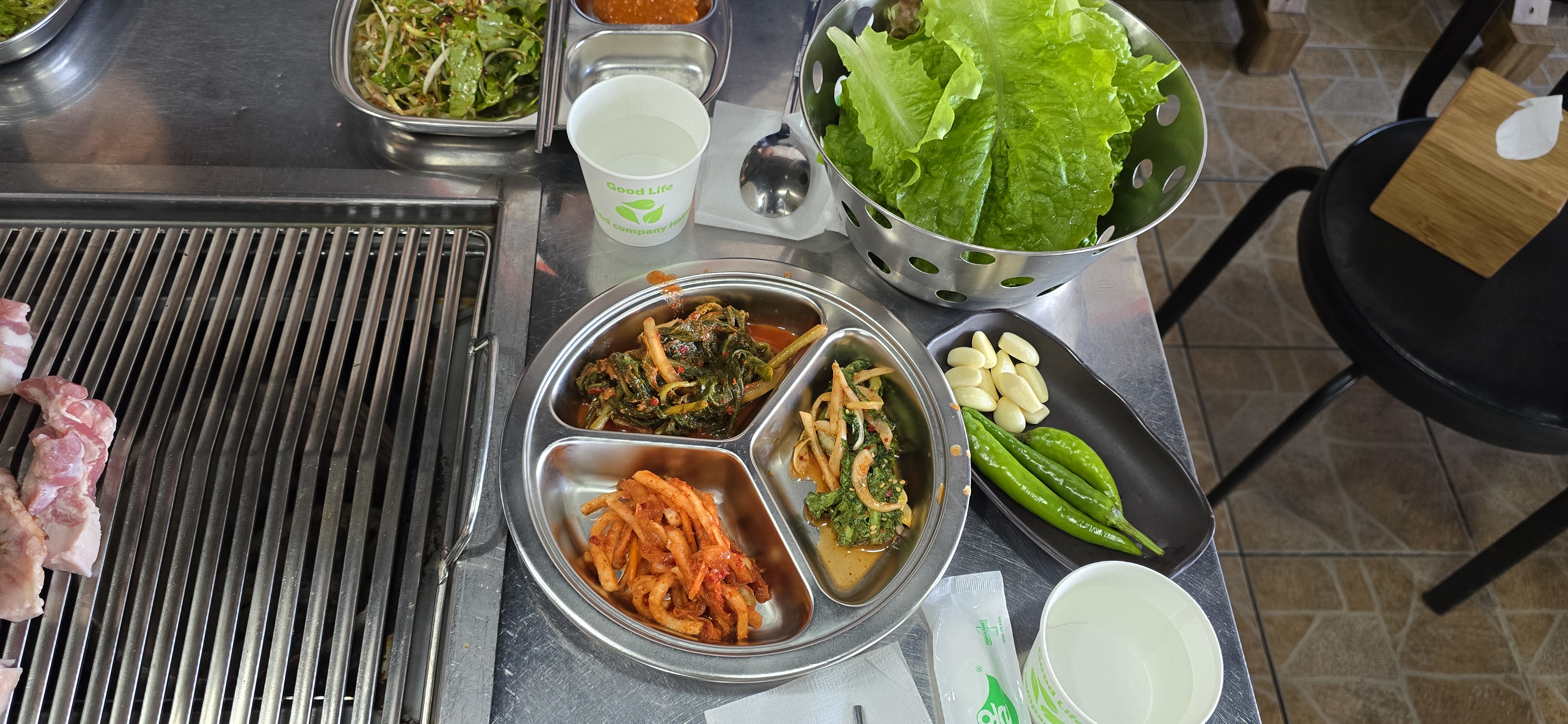 기본 상차림으로 6가지 밑반찬이 나오고, 쌈장과 파절이는 인당 1개씩 나옵니다.