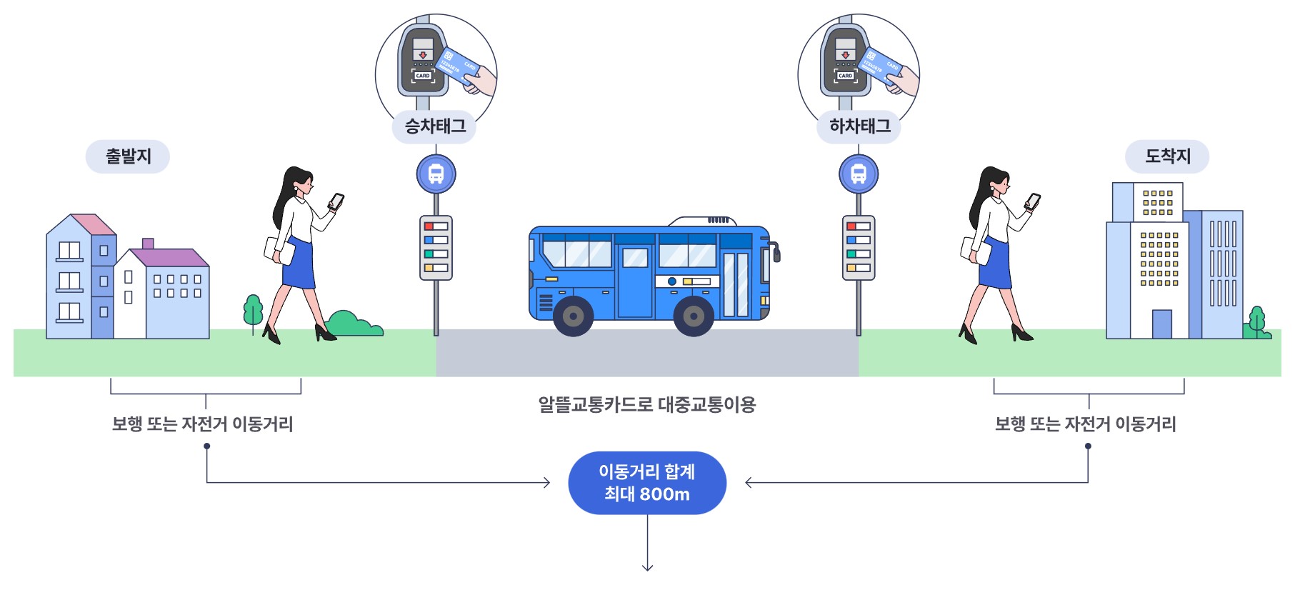 예를 들어, 집에서 출발할 때 알뜰교통카드 앱을 켜고 '출발'을 누릅니다. 그리고 알뜰교통카드로 승하차 태그를 하며 버스나 지하철을 이용합니다. 도착지에 도착한 후 '도착' 버튼을 누릅니다.