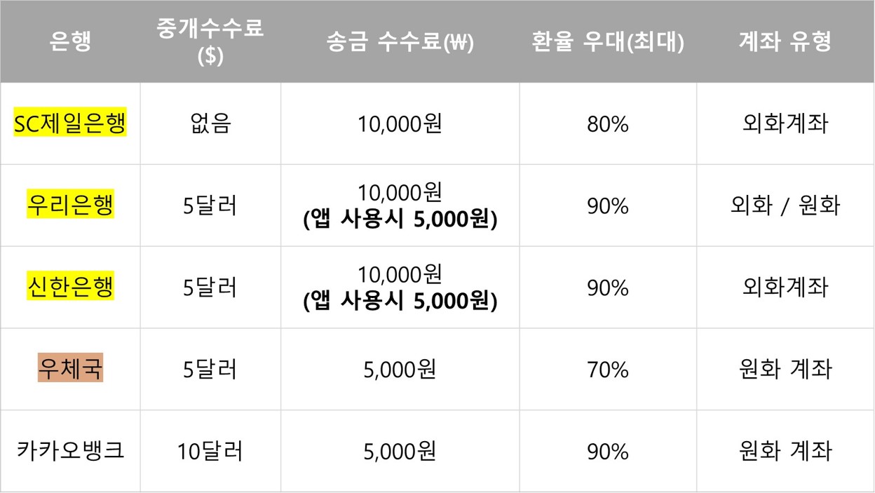 은행별로 수수료와 환전수수료 우대율을 비교해 보면 우체국의 수수료가 건당 10,000원 정도로 가장 낮습니다. 다음으로 SC제일은행, 우리은행, 신한은행의 수수료가 건당 15,000원 정도입니다.