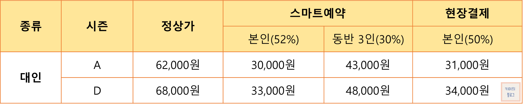 KB Pay로 결제하거나 신한카드 사용 시 스마트 예약은 40%, 현장구매는 35% 할인 혜택을 받을 수 있습니다. 스마트 예약을 통한 구입을 추천드립니다.