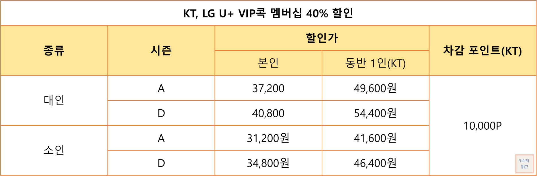 KT 멤버십 회원은 본인 40%, 동반인 20% 할인 혜택을 받을 수 있고, 본인 구매 시에만 10,000포인트가 차감됩니다.
