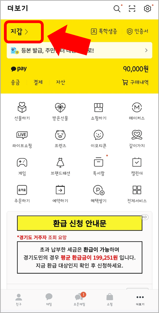 ① 먼저 카카오톡 전체 메뉴에서 지갑을 선택합니다.
