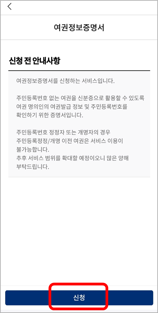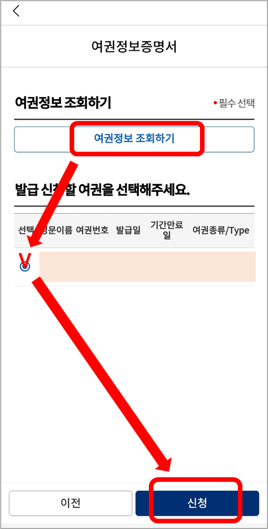 ⑥ 여권정보 조회하기를 터치해서 본인의 여권을 선택한 후 신청합니다.