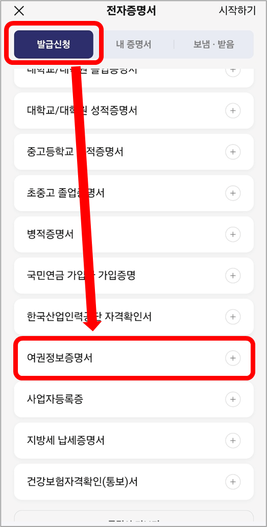 ③ 발급신청 가능한 전자증명서 목록에서 여권정보증명서를 선택합니다.