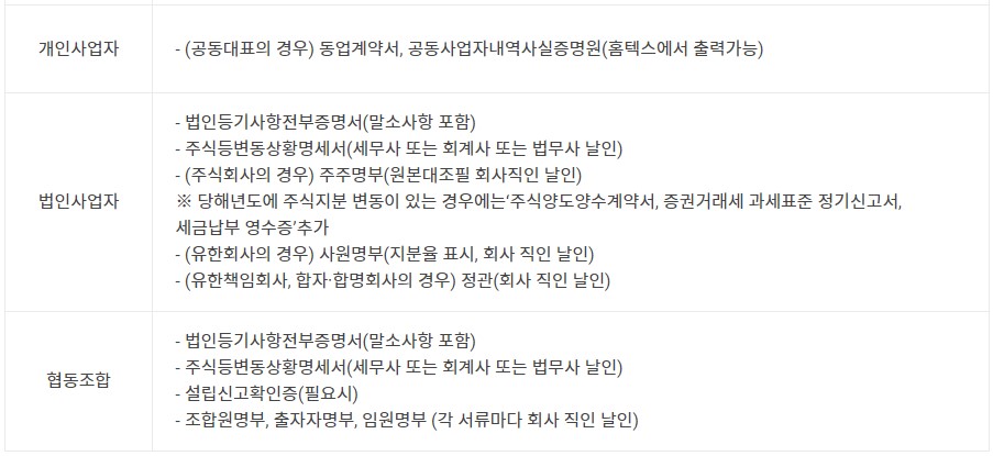 법인사업자와 협동조합은 아래와 같이 더 많은 서류가 필요합니다.