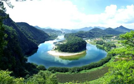 영월 한반도면 옹정리에 위치한 한반도지형은 이름 그대로 한반도와 똑같이 생긴 지형을 자랑하는 영월의 대표적인 자연 명소입니다. 왜 그러냐면, 서강이 굽이쳐 흐르면서 만들어낸 빼어난 경관이 마치 지도 속 한반도를 옮겨놓은 듯한 모습을 하고 있거든요.