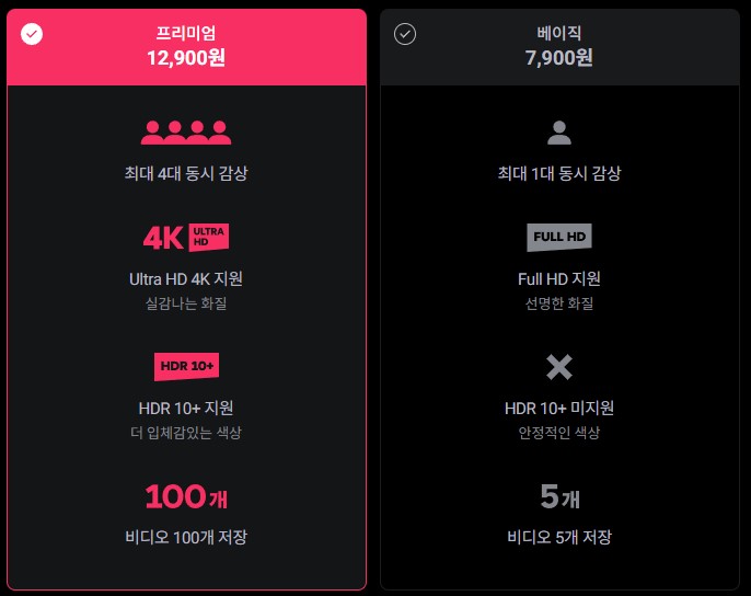 베이직은 FHD 화질 시청이 가능하고 최대 1대의 기기로만 동시 감상이 가능합니다. 가격은 7,900원으로 다른 OTT에 비해 확실히 저렴한 가격이 장점입니다.