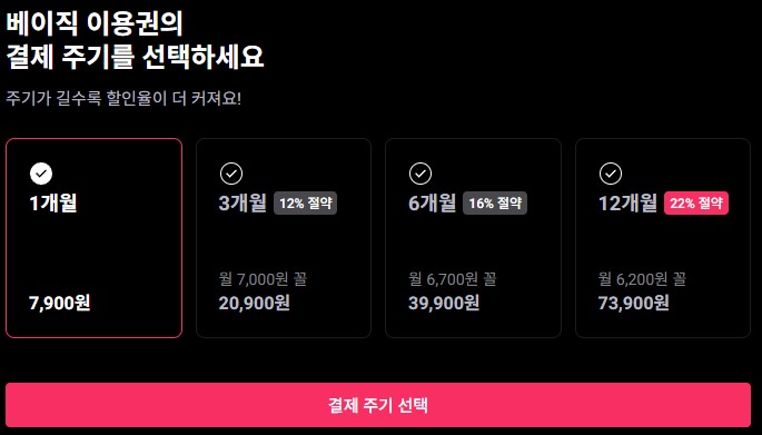 혼자 이용하는 분이라면 베이직 요금제를 이용하여 7,900원에 구독할 수 있습니다. 또한 베이직 요금제는 여러 달을 한 번에 결제할수록 할인을 받을 수 있습니다. 1년 치를 한 번에 결제할 시 22%로 할인된 73,900원으로 이용이 가능합니다.