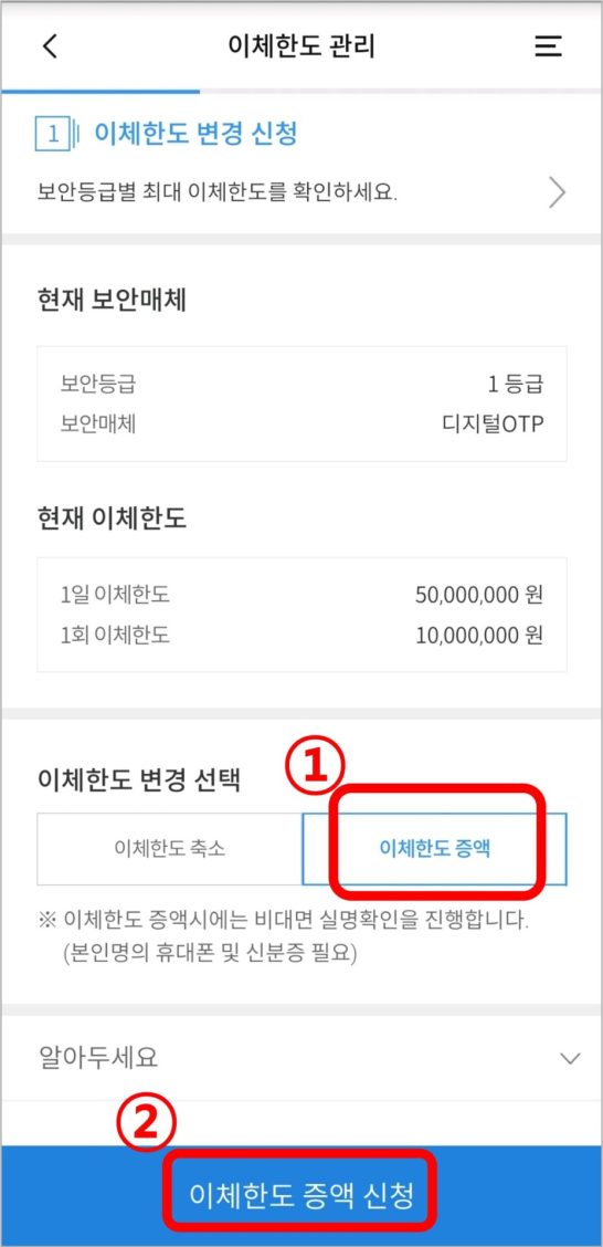 • 이체한도 증액 : 이체한도 증액 신청을 위해서는 실명확인이 필요합니다. 주민등록증이나 운전면허증을 준비하시기 바랍니다.
