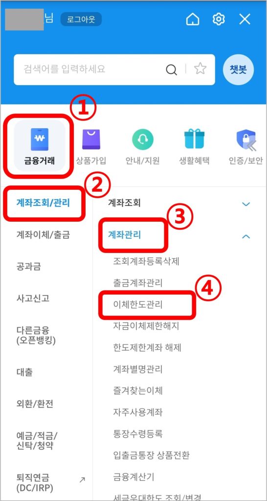 [금융거래] → [계좌조회/관리] → [계좌관리] → [이체한도 관리] 순으로 선택합니다.